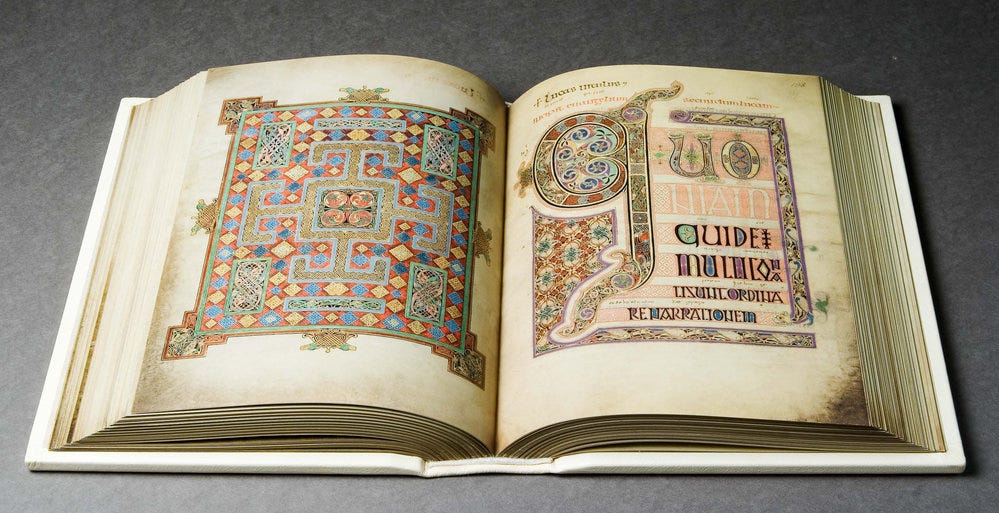 I suspected that I couldn’t entirely escape the minimalist logic of the Internet. That would require considerable skill, and I’m no graphic designer. But maybe I could pull in a different direction? So I chose a starting point about as far from the digital era as one can imagine: a book created 1,300 years ago, on a tidal island off the coast of Northumbria, northeast England.